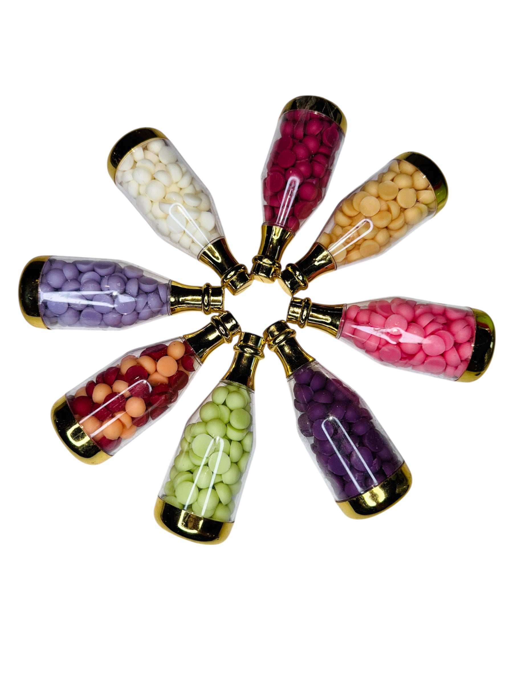 A variety of four mini mystery champagne and wine scented bubble wax melts! Colors and scents vary. Fragrances may include strawberries and champagne, vanilla champagne, lavender champagne, pear champagne, white zinfandel wine, merlot, Tuscan wine, cherry champagne, sparkling sangria, pomegranate champagne, cabernet, burgundy rose, and more! Comes in the plastic bottle as pictured! Plastic bottles opens at the bottom. Para soy wax blend used.