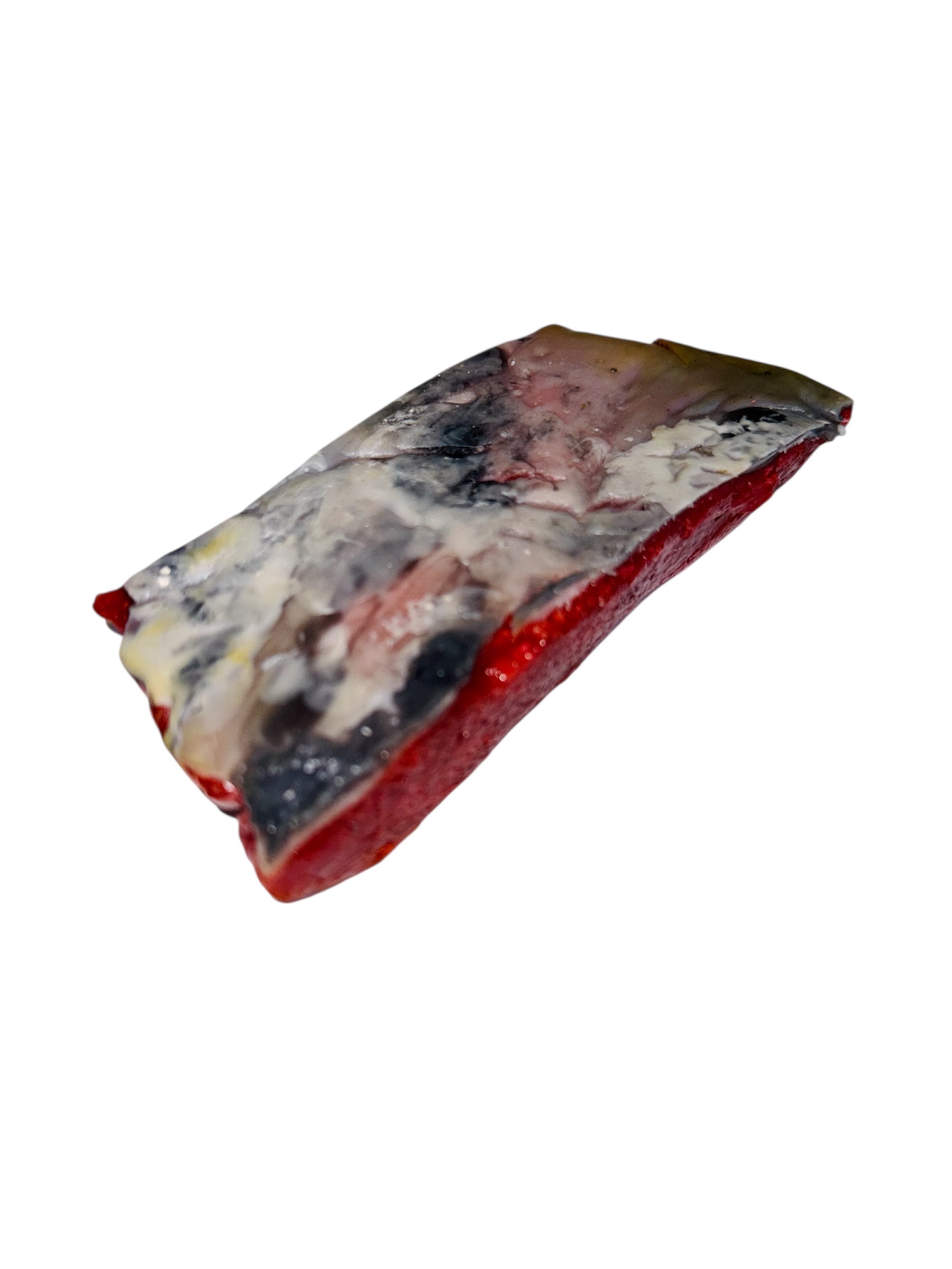 Realistic looking candied salmon cuts! They smell absolutely delicious notes includes orange, tobacco leaf, lavender, wood, patchouli, caramelized vanilla and musk. Random sizes to total around 4 oz. Para soy wax blend, gel wax and carrier oil used.